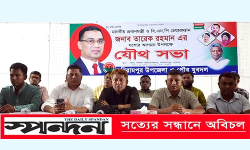 রোববার রাতে জেলা পরিষদের অডিটোরিয়মে অনুষ্ঠিত সভায় উপজেলা যুবদলের আহবায়ক মোতাহারুল ইসলাম রিয়াদের সভাপতিত্বে প্রধান অতিথির বক্তব্য রাখেন যশোর জেলা যুবদলের আহবায়ক এম তমাল আহমেদ, বিশেষ অতিথির বক্তব্য রাখেন জেলা যুবদলের সদস্য সচিব আনসারুল হক রানা, জেলা যুবদলের যুগ্ম আহবায়ক আমিনুর রহমান মধু, সদস্য ওয়াসী আহম্মেদ উজ্জ্বল। উপজেলা যুবদলের যুগ্ম আহবায়ক রাসেল হুসাইন ও পৌর যুবদলের সদস্য সচিব বিল্লাল হোসেনের পরিচালনায় সভায় অন্যান্যের মধ্যে উপস্থিত ছিলেন ও বক্তব্য রাখেন উপজেলা যুবদলের সদস্য সচিব সাইদুল ইসলাম, পৌর যুবদলের সিনিয়র যুগ্ম আহবায়ক সাইফুল ইসলাম, উপজেলা যুবদলের যুগ্ম আহবায়ক আইয়ুব আলী, মিজানুর রহমান, মাসুদ পারভেজ রুবেল, মামুন হোসেন, ফরহাদ হোসেন প্রমূখ। সভা শেষে প্রধানমন্ত্রী তারেক রহমানের আগমনকে স্বাগত জানিয়ে যুবদল প্রচার মিছিল বের করে। মিছিলটি পৌরশহরের গুরুত্বপূর্ণ সড়ক প্রদক্ষিণ করে।