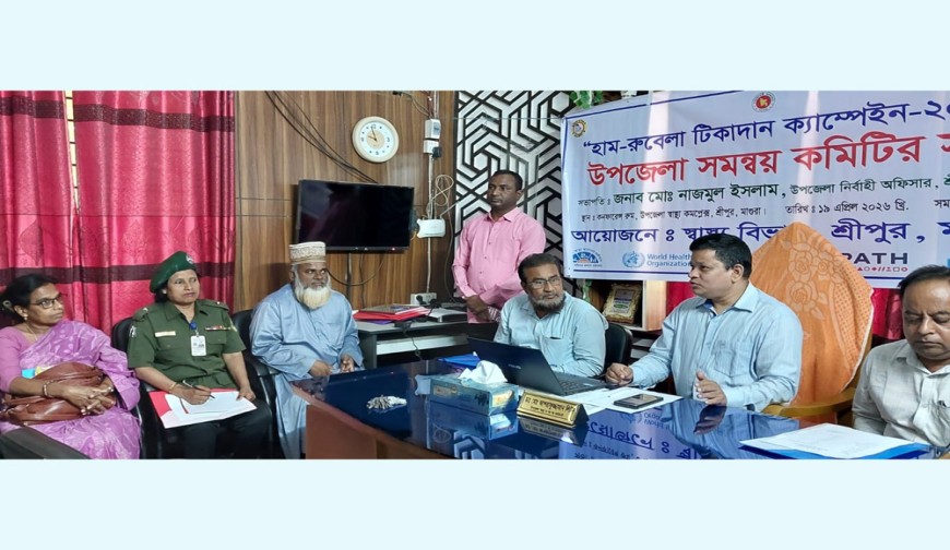 শ্রীপুর (মাগুরা) প্রতিনিধি : মাগুরার শ্রীপুরে “ হাম-রুবেলা টিকাদান “ ক্যাম্পেইন-২০২৬ উপলক্ষে উপজেলা সমন্বয় কমিটির সভা অনুষ্ঠিত হয়েছে। উপজেলা স্বাস্থ্য বিভাগের আয়োজনে রোববার সকালে উপজেলা স্বাস্থ্য ও পরিবার পরিকল্পনা কর্মকর্তার রুমে এ সমন্বয় সভার আয়োজন করা হয়।